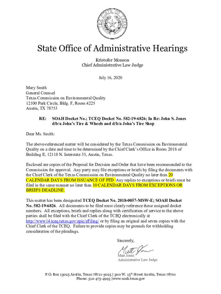 State Office of Administrative Hearings Kristopher Monsoon Chief Administrative Law Judge July 16, 2020, Mary Smith General Counsel Texas Commission on Environmental Quality 12100 Park Circle, Bldg.