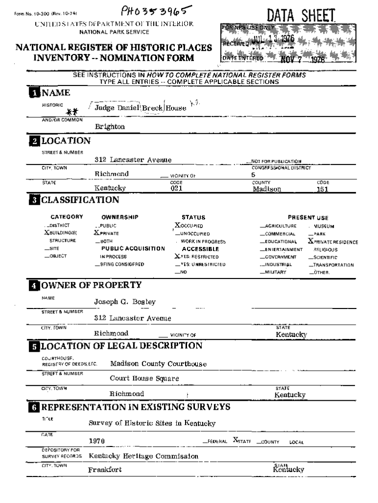 DATA SHEET. Form No. 10300 (Rev. 1074)UNITED STATES DEPARTMENT OF THE INTERIOR NATIONAL PARK SERVICENATIONAL REGISTER OF HISTORIC PLACES INVENTORY NOMINATION Forms! MtmiK&wv$&SEE INSTRUCTIONS IN HOW