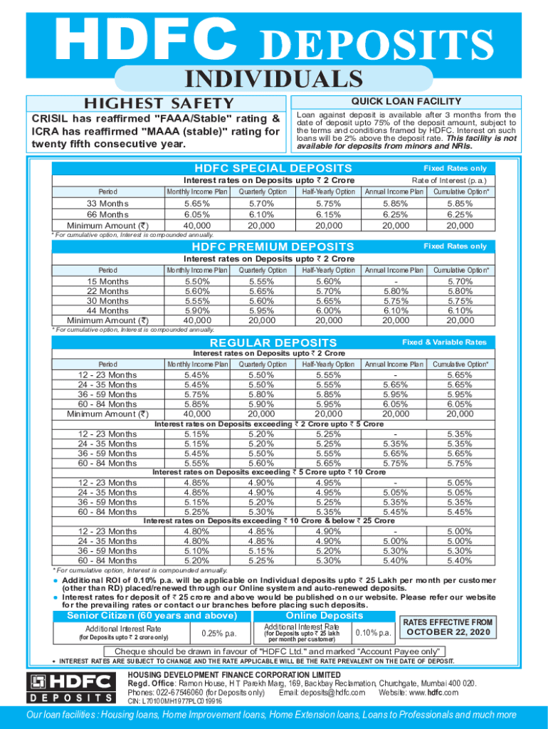 HDFC DEPOSITS INDIVIDUALS HIGHEST SAFETYQUICK LOAN FACILITY Loan against deposit is available after 3 months from the date of deposit unto 75% of the deposit amount, subject to the terms and conditions