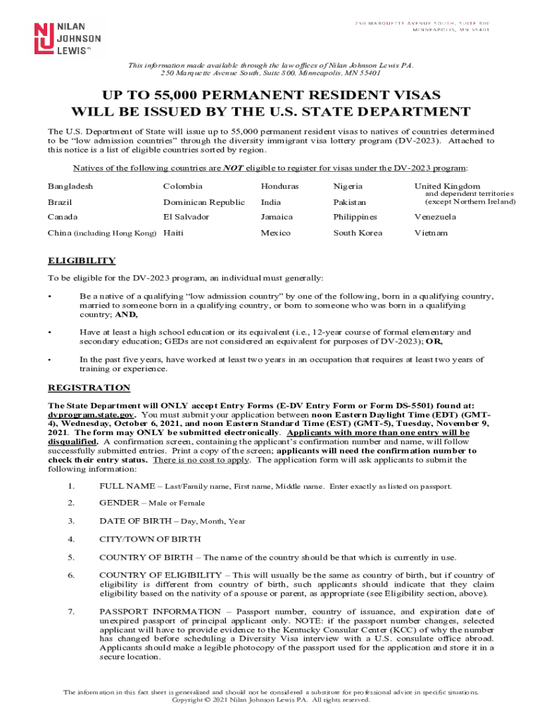 This information made available through the law offices of Milan Johnson Lewis PA. 250 Marquette Avenue South, Suite 800, Minneapolis, MN 55401UP TO 55,000 PERMANENT RESIDENT VISAS WILL BE ISSUED