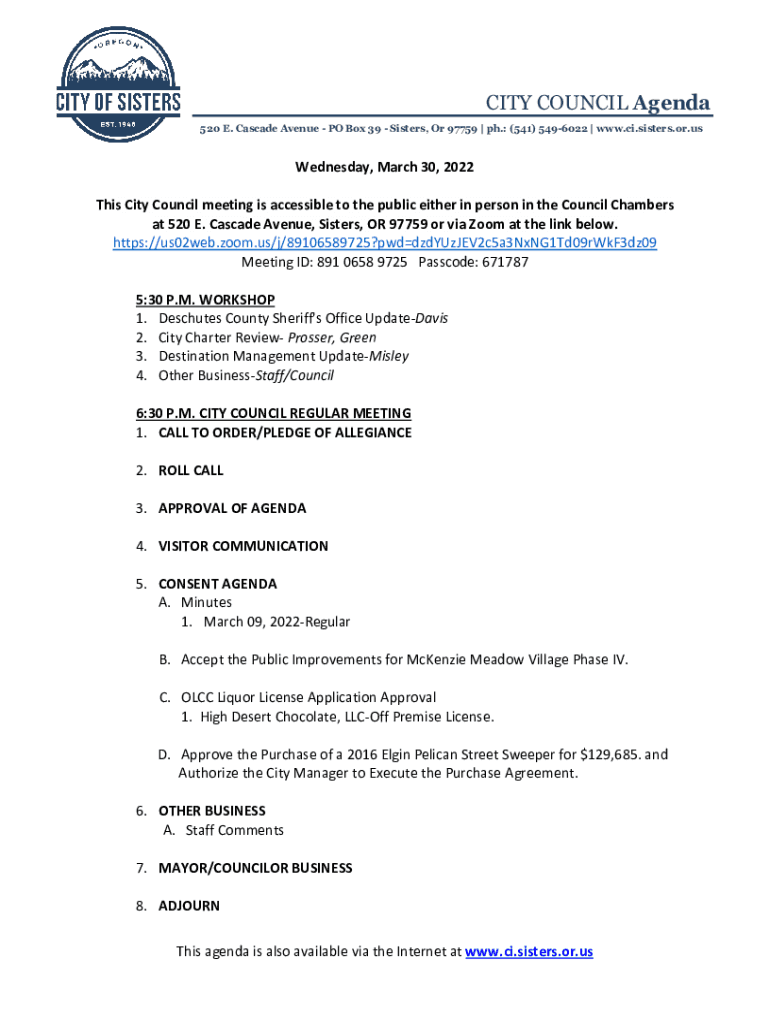CITY COUNCIL Agenda 520 E. Cascade Avenue PO Box 39 Sisters, Or 97759 | pH.: (541) 5496022 | www.ci.sisters.or.usWednesday, March 30, 2022, This City Council meeting is accessible to the public either