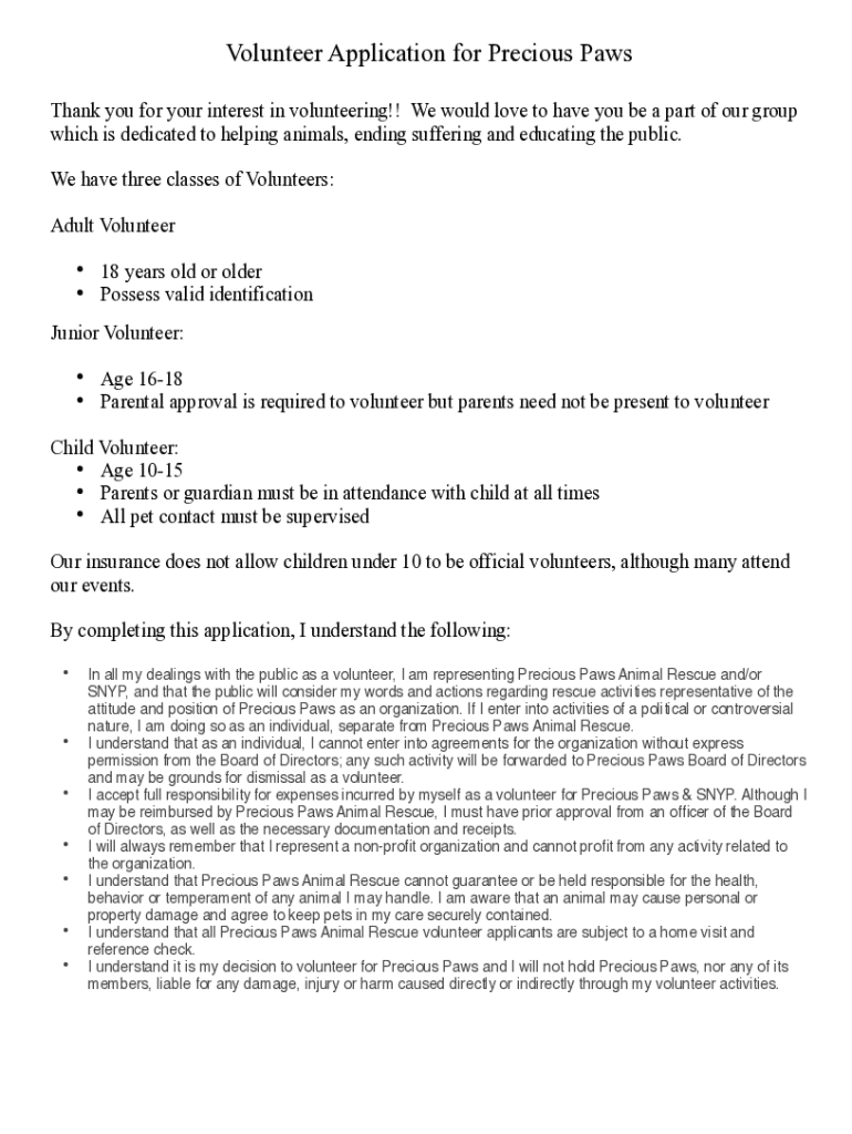 Volunteer Application for Precious Paws Thank you for your interest in volunteering!! We would love to have you be a part of our group which is dedicated to helping animals, ending suffering and educating