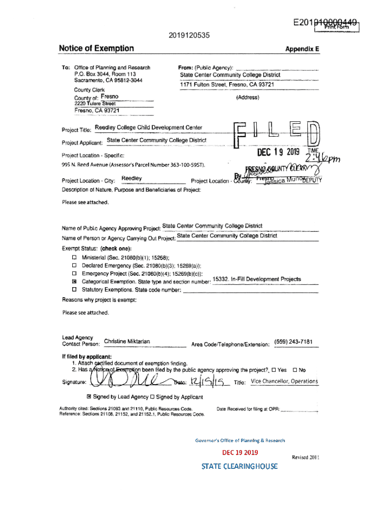 E201p19ggj2019120535Notice of Exemption To : Office of Planning and Research. O. Box 3044, Room 113 Sacramento, CA 958123044Appendix E From: (Public Agency) : State Center Community College District1171