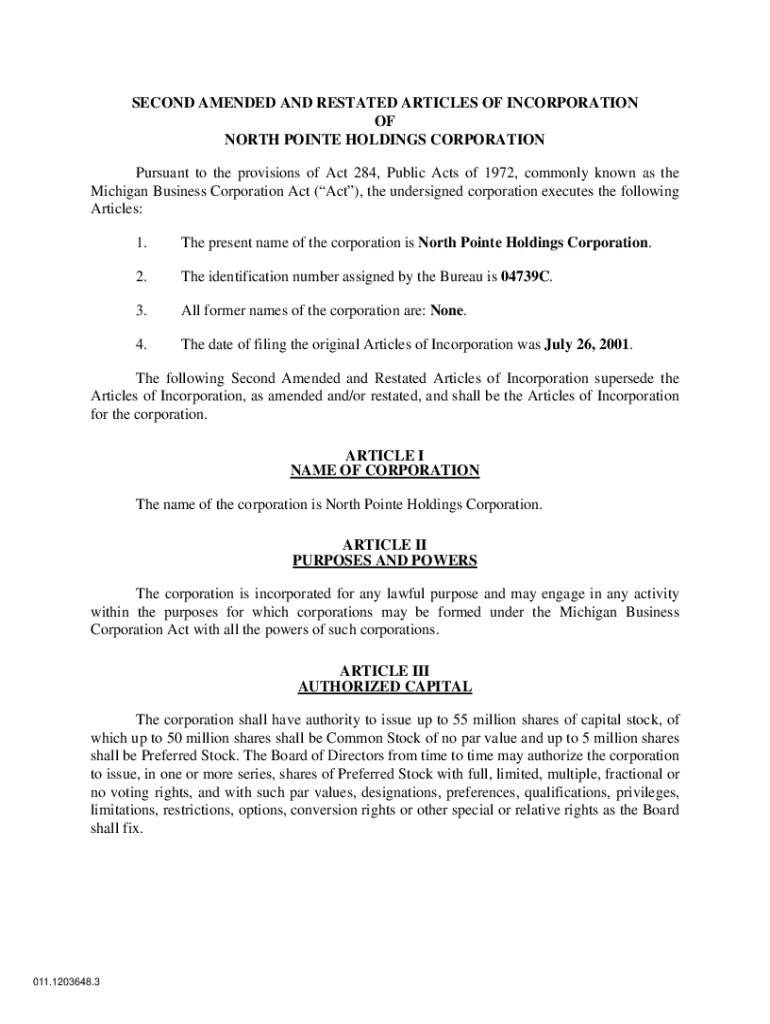 SECOND AMENDED AND RESTATED ARTICLES OF INCORPORATION OF NORTH POINT HOLDINGS CORPORATION Pursuant to the provisions of Act 284, Public Acts of 1972, commonly known as the Michigan Business Corporation