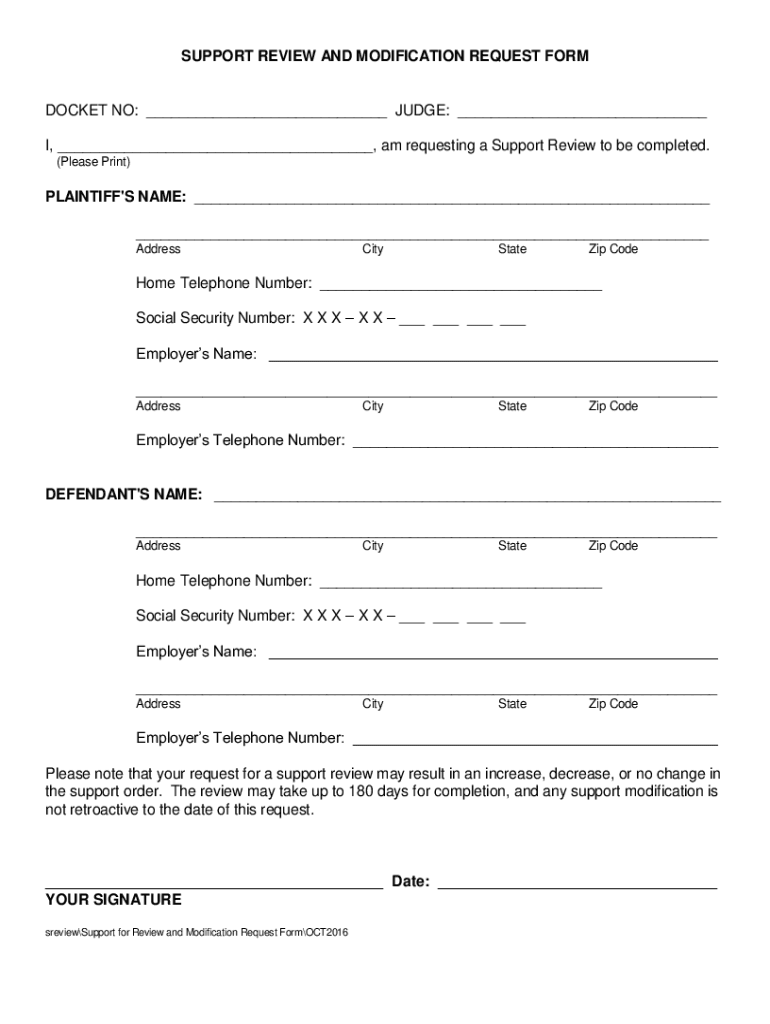 SUPPORT REVIEW AND MODIFICATION REQUEST FORMDOCKET NO: ___ JUDGE: ___ I, ___, am I requesting a Support Review to be completed. (Please Print)PLAINTIFF\'S NAME: ___ ___ AddressCityStateZip Wodehouse