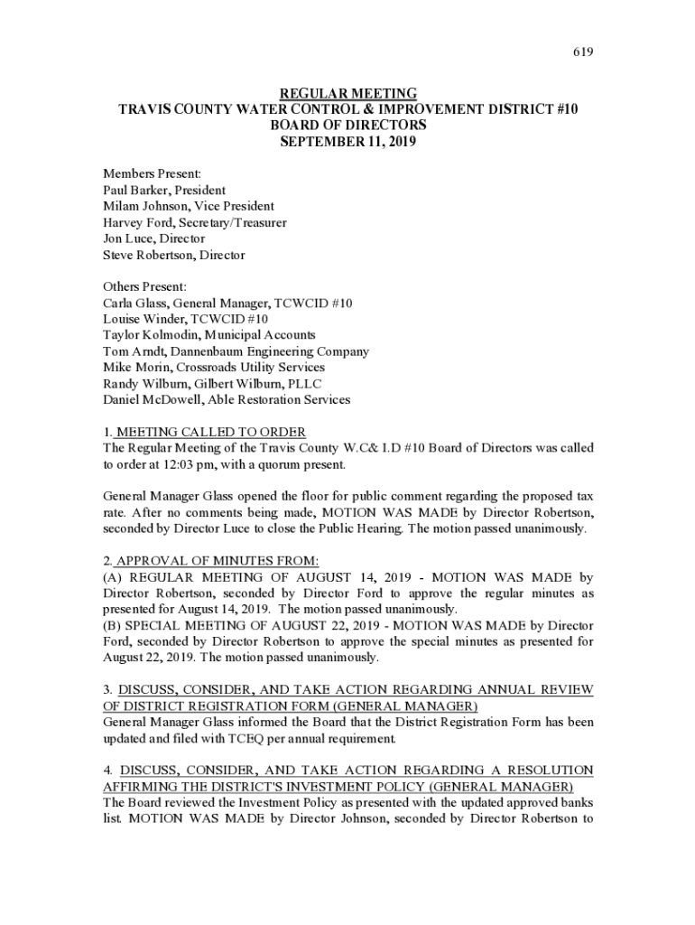 619 REGULAR MEETING TRAVIS COUNTY WATER CONTROL & IMPROVEMENT DISTRICT #10 BOARD OF DIRECTORS SEPTEMBER 11, 2019, Members Present: Paul Barker, President Milan Johnson, Vice President Harvey Ford,