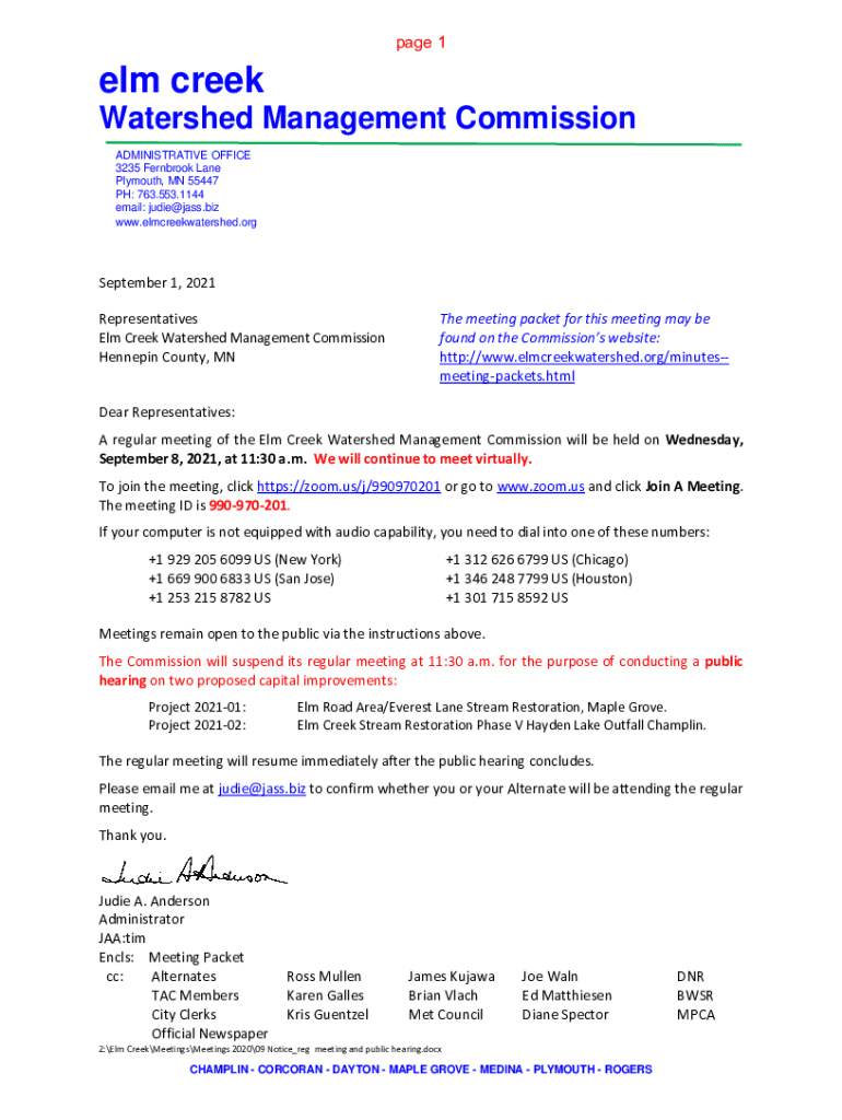 Page 1elm creek Watershed Management Commission ADMINISTRATIVE OFFICE 3235 Fern brook Lane Plymouth, MN 55447 PH: 763.553.1144 email: judie@jass.biz www.elmcreekwatershed.orgSeptember 1, 2021 Representatives