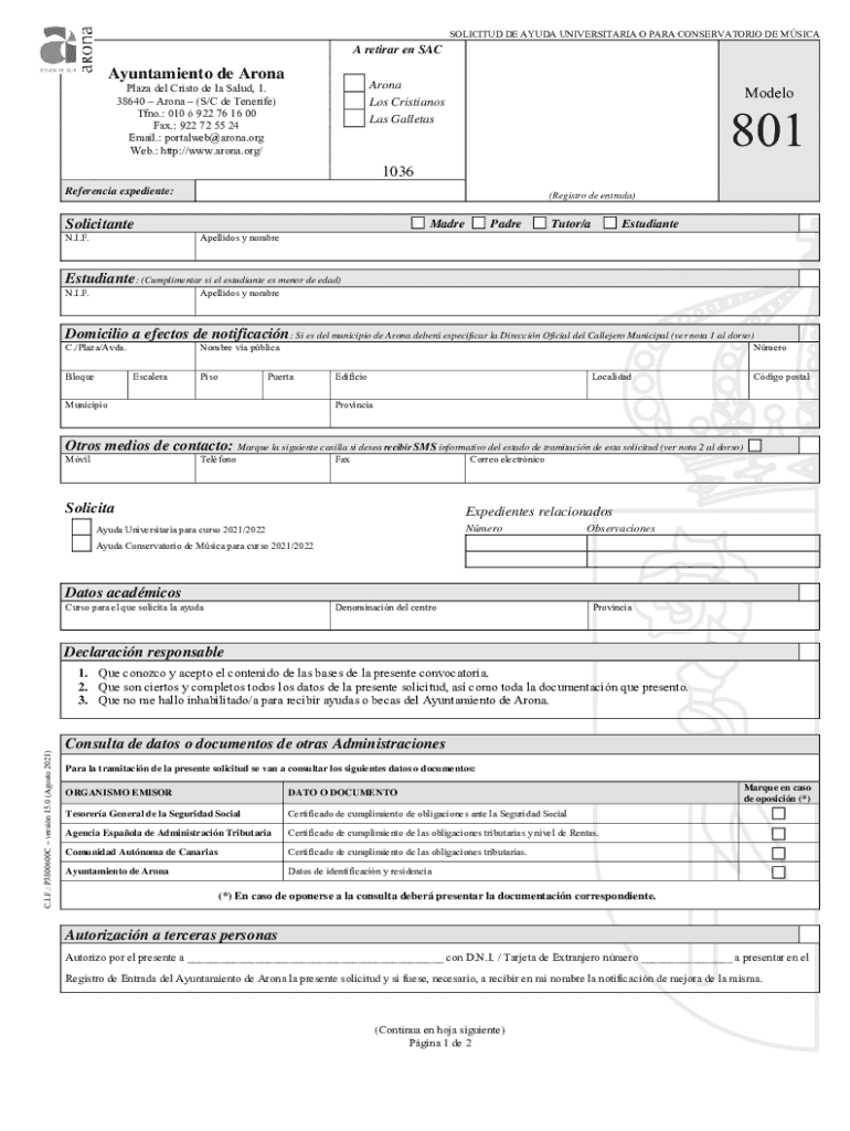 SOLICITED DE AYU DA UNIVERSITARIA O PARA CONSERVATORY DE MSI CAA retired en SACAyuntamiento de AronaEn case de Que SU impressed lo permit, Imprimis a DOUBLE CARA. Arena Los Cristiano Las GalletasPlaza