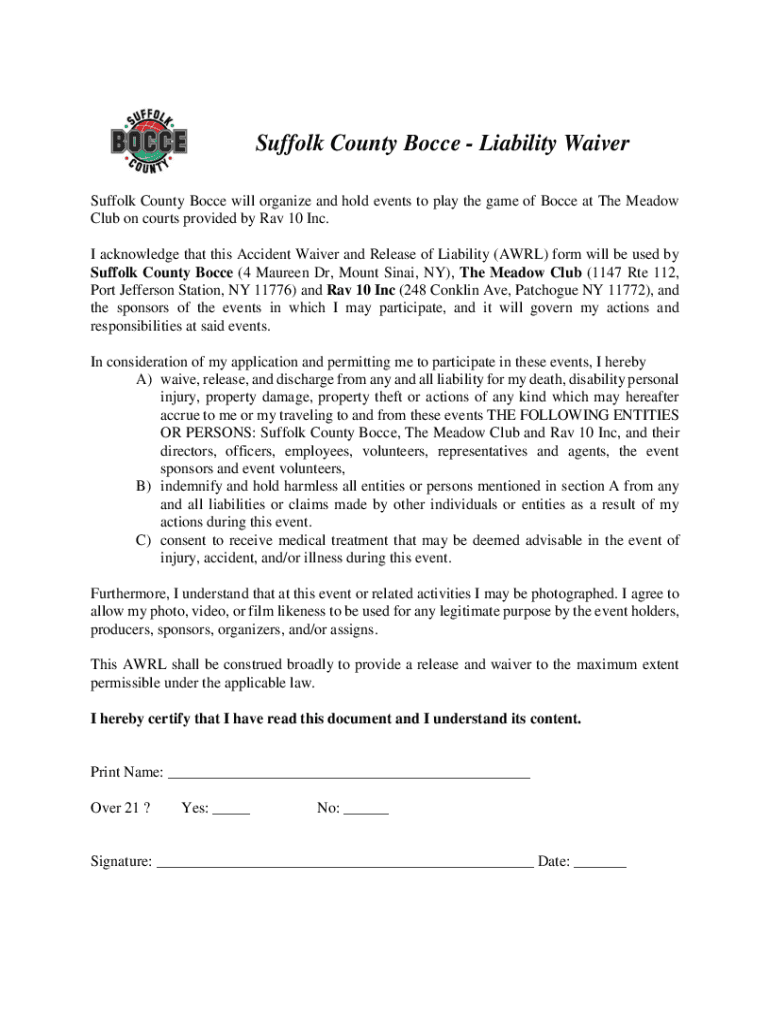Suffolk County Bonce Liability Waiver Suffolk County Bonce will organize and hold events to play the game of Bonce at The Meadow Club on courts provided by Ran 10 Inc. I acknowledge that this Accident