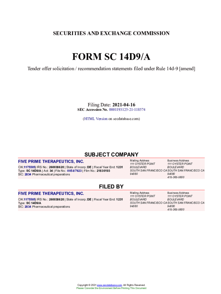Get the free FIVE PRIME THERAPEUTICS, INC. Form SC 14D9/A Filed 2021-04-16. Accession Number