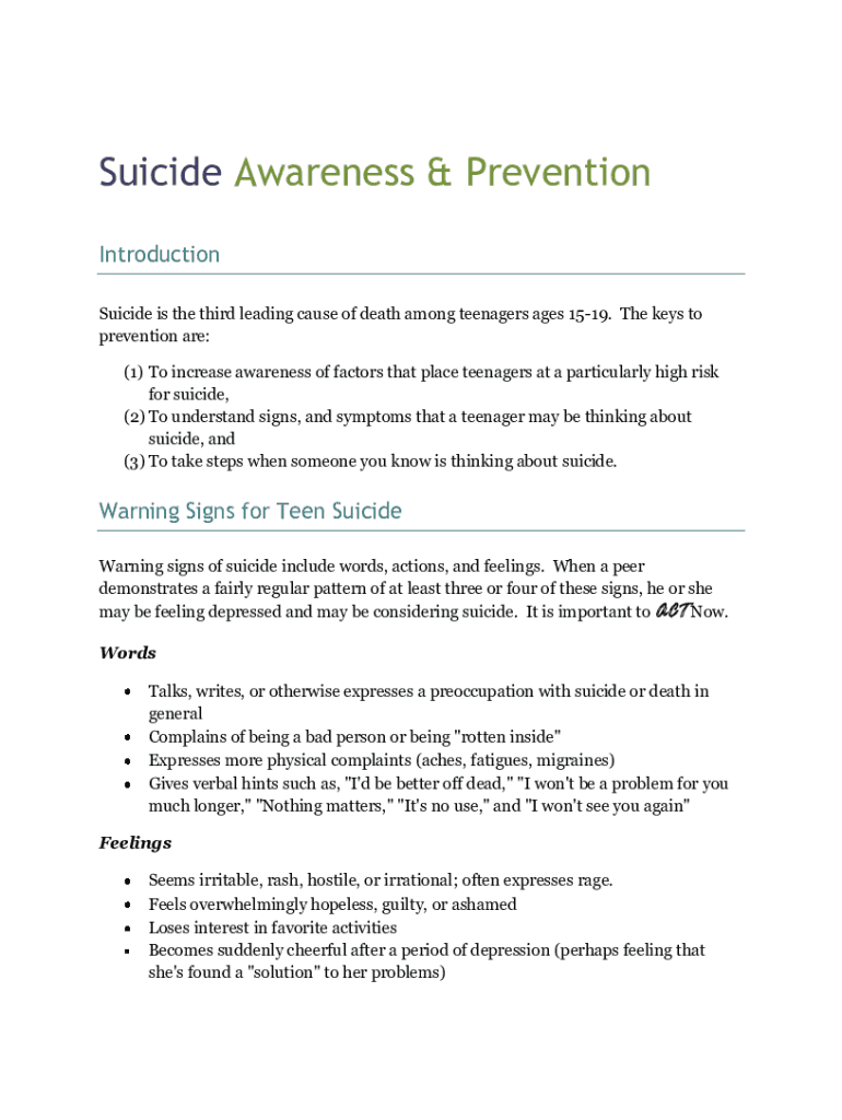 Get the free Youth With VoicesACTNow Participant Guide. Adolescent Suicide Prevention Program