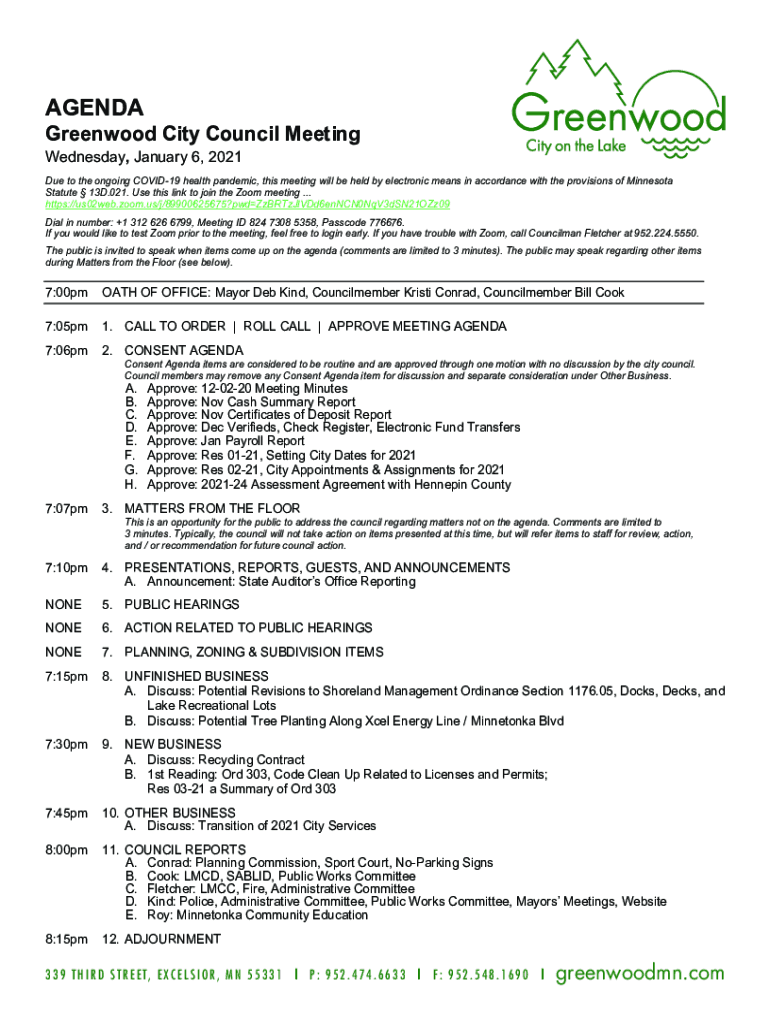 AGENDA Greenwood City Council Meeting Wednesday, January 6, 2021, Due to the ongoing COVID-19 health pandemic, this meeting will be held by electronic means in accordance with the provisions of Minnesota
