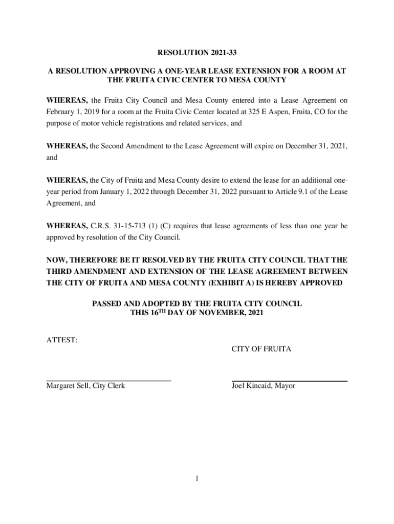 RESOLUTION 202133 A RESOLUTION APPROVING A NEYMAR LEASE EXTENSION FOR A ROOM AT THE FRUIT CIVIC CENTER TO MESA COUNTY WHEREAS, the Fruit City Council and Mesa County entered into a Lease Agreement