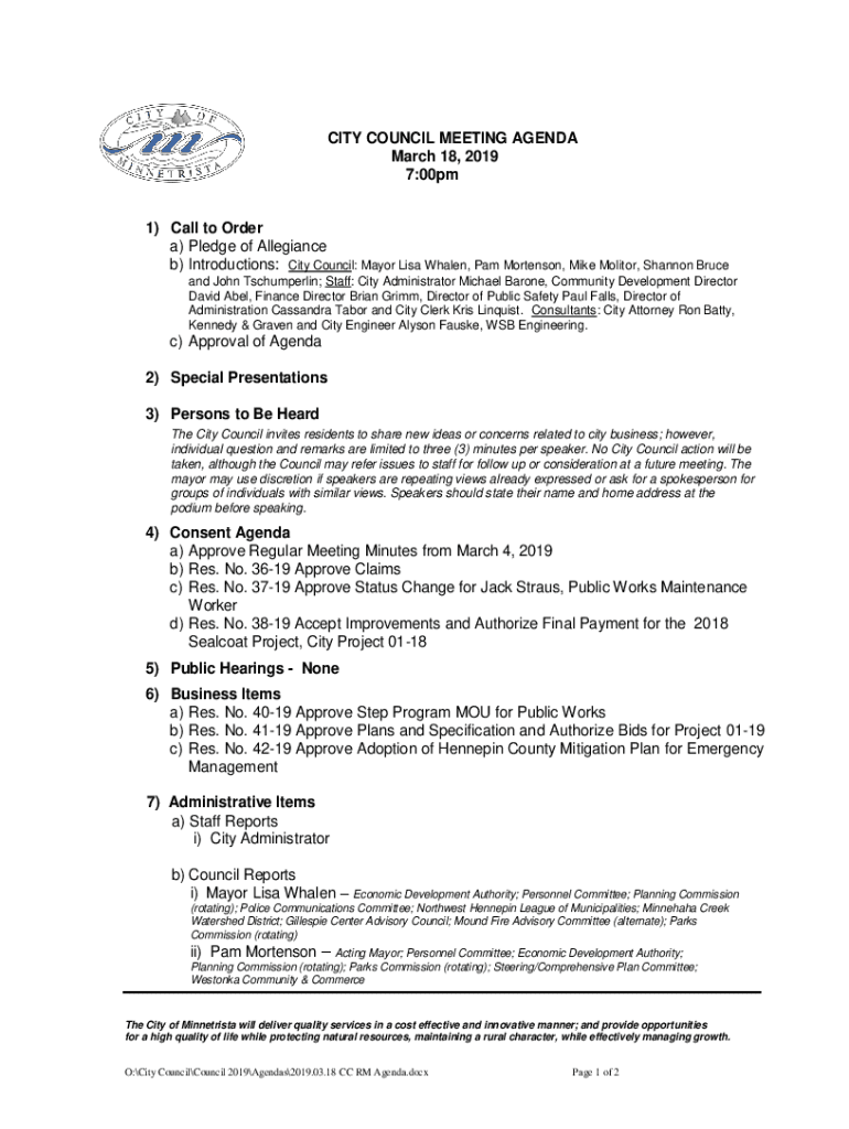 CITY COUNCIL MEETING AGENDA March 18, 2019 7:00pm1) Call to Order a) Pledge of Allegiance b) Introductions: City Council: Mayor Lisa Whale, Pam Mortensen, Mike Monitor, Shannon Bruce and John Tschumperlin;