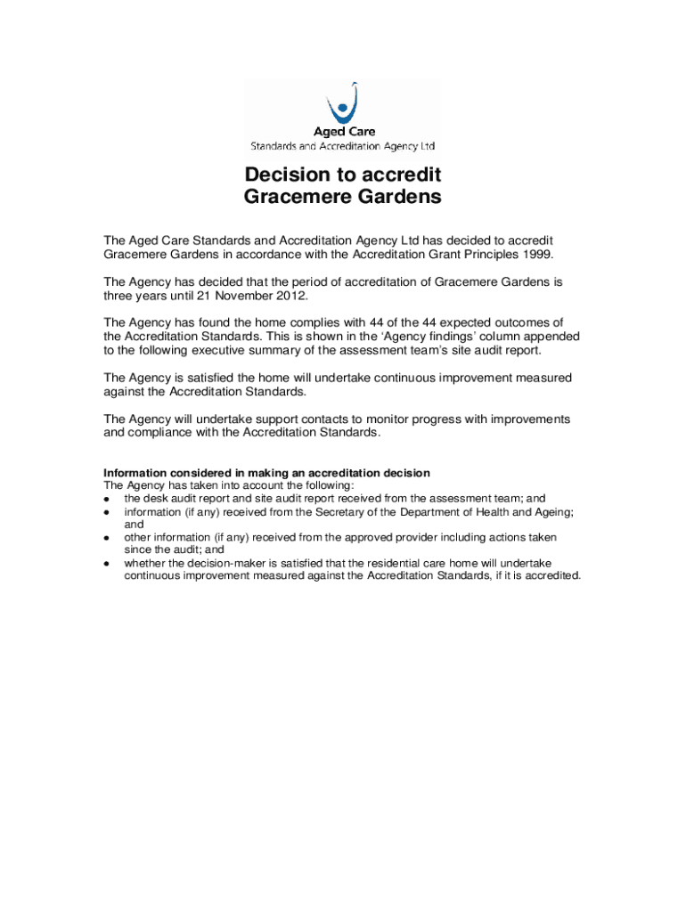Decision to accredit Grace mere Gardens The Aged Care Standards and Accreditation Agency Ltd has decided to accredit Grace mere Gardens in accordance with the Accreditation Grant Principles 1999.