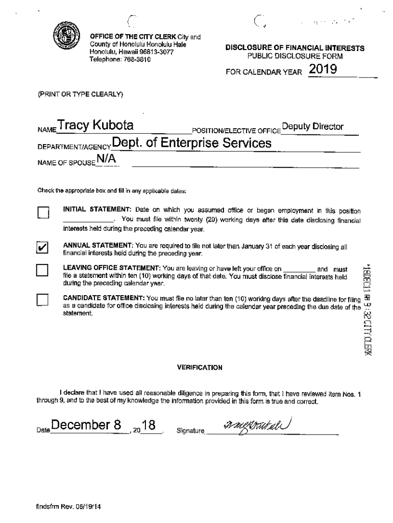 C %9OFFICE OF THE CITY CLERK City and County of Honolulu Hale Honolulu, Hawaii 968133077 Telephone: 7683810DISCLOSURE OF FINANCIAL INTERESTS PUBLIC DISCLOSURE FORM FORCALENDARYEAR2019(PRINT OR TYPE