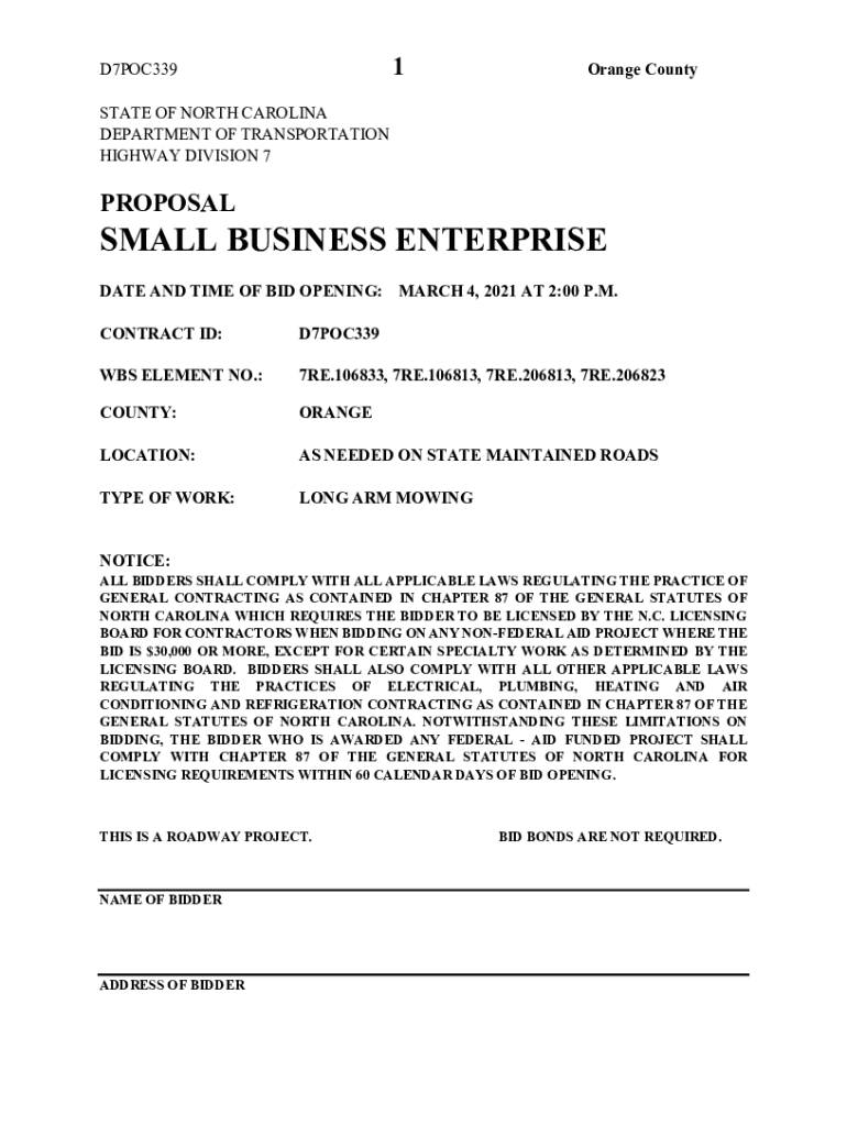 1D7POC339Orange CountySTATE OF NORTH CAROLINA DEPARTMENT OF TRANSPORTATION HIGHWAY DIVISION 7PROPOSALSMALL BUSINESS ENTERPRISE DATE AND TIME OF BID OPENING: MARCH 4, 2021, AT 2:00 P.M. CONTRACT ID:D7POC339WBS