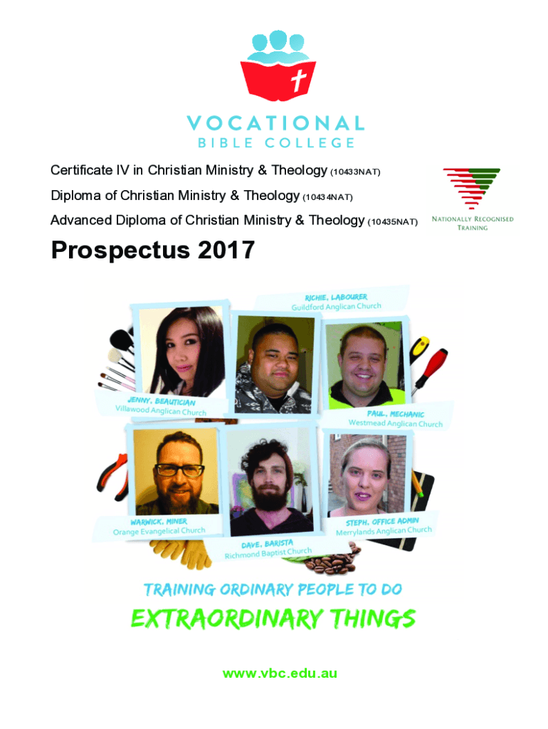 Certificate IV in Christian Ministry & Theology (10433NAT) Diploma of Christian Ministry & Theology (10434NAT) Advanced Diploma of Christian Ministry & Theology (10435NAT)Prospectus 2017www.BBC.edu.prospectus