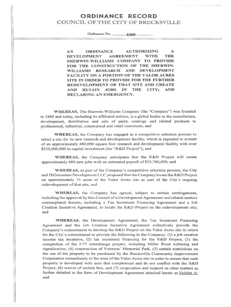 ORDINANCE RECORD COUNCIL THE CITY OF BROWNSVILLE Ordinance No. AN ORDINANCE AUTHORIZING A DEVELOPMENT AGREEMENT WITH THE SHERWINWILLIAMS COMPANY TO PROVIDE FOR THE CONSTRUCTION OF THE SHERWINWILLIAMS