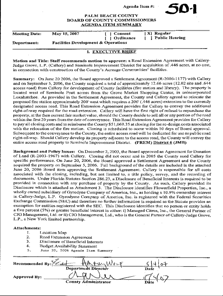 Agenda Item #: PALM BEACH COUNTY BOARD OF COUNTY COMMISSIONERS AGENDA ITEM SUMMARY Meeting Date: Department:May 15, 2007[ ] Consent [ ] Ordinance Facilities Development & Operations501[X] Regular
