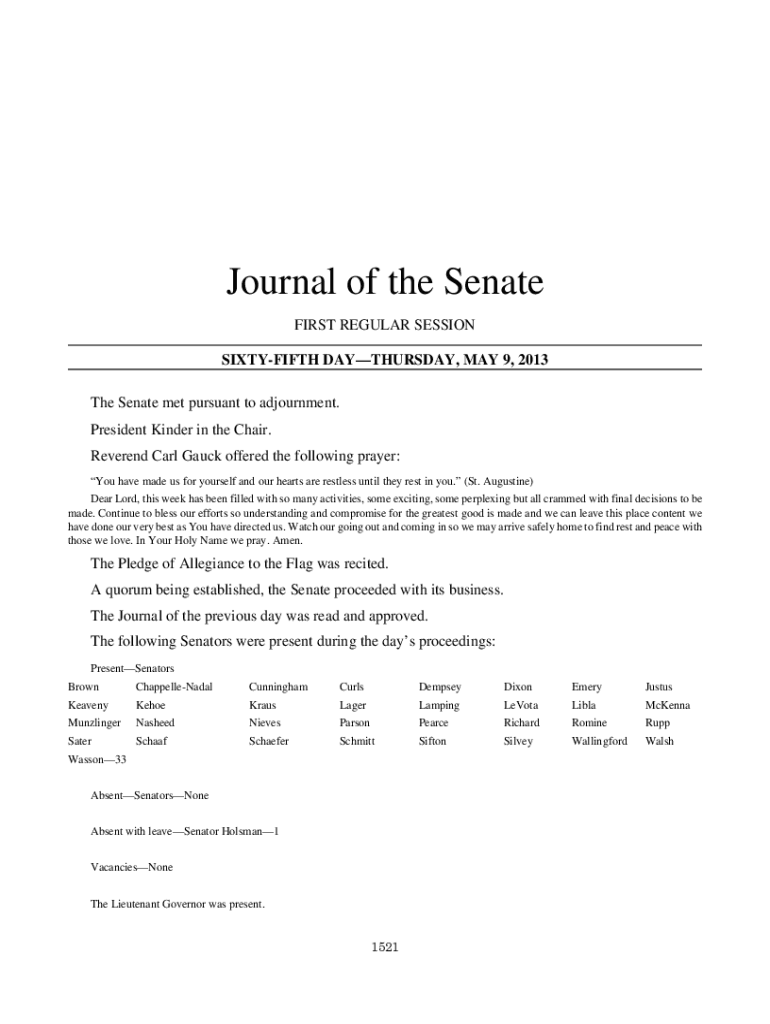 Journal of the Senate FIRST REGULAR SESSION SIXTIETH THURSDAY, MAY 9, 2013, The Senate met pursuant to adjournment. President Kinder in the Chair. Reverend Carl Back offered the following prayer: