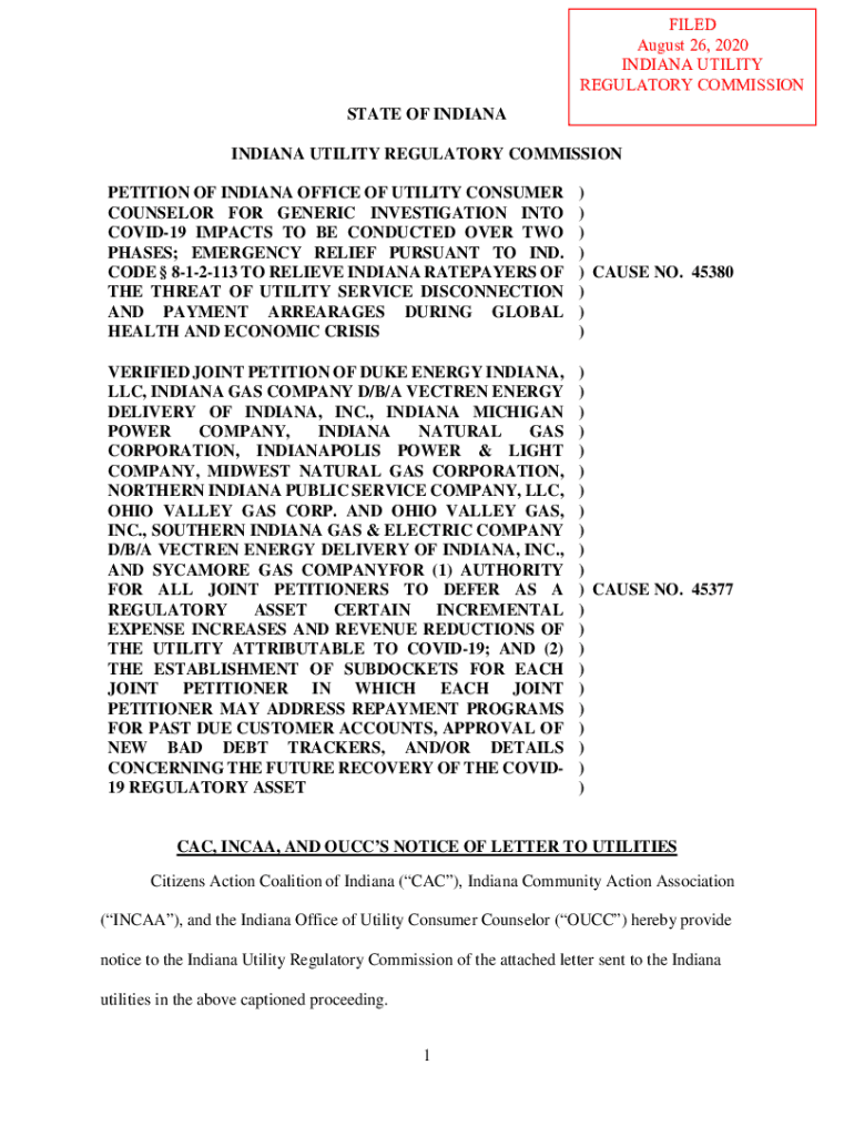 FILED August 26, 2020, INDIANA UTILITY REGULATORY COMMISSIONSTATE OF INDIANA UTILITY REGULATORY COMMISSION PETITION OF INDIANA OFFICE OF UTILITY CONSUMER COUNSELOR FOR GENERIC INVESTIGATION INTO COVID-19