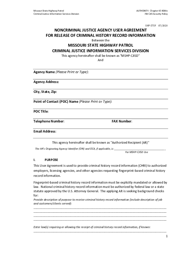 Missouri State Highway Patrol Criminal Justice Information Services DivisionAUTHORITY: Chapter 43 RSM FBI CSIS Security Voiceprint Forrest Form SHP575F 07/2020NONCRIMINAL JUSTICE AGENCY USER AGREEMENT