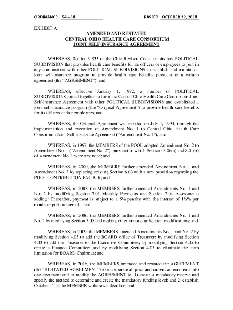 ORDINANCE: 54 18PASSED: OCTOBER 22, 2018EXHIBIT A AMENDED AND RESTATED CENTRAL OHIO HEALTH CARE CONSORTIUM JOINT REINSURANCE AGREEMENT WHEREAS, Section 9.833 of the Ohio Revised Code permits any POLITICAL