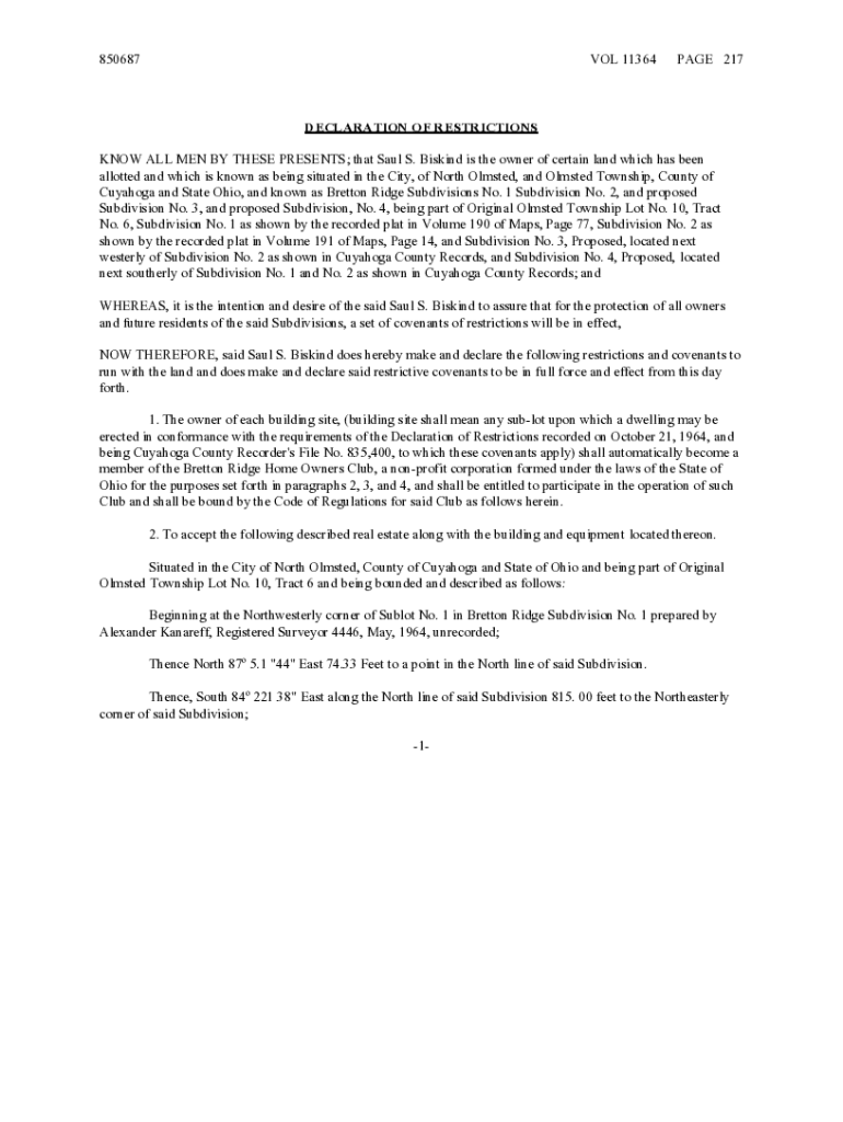 850687VOL 11364PAGE 217DECLARATION OF RESTRICTIONS KNOW ALL MEN BY THESE PRESENTS; that Saul S. Biskind is the owner of certain land which has been allotted and which is known as being situated in