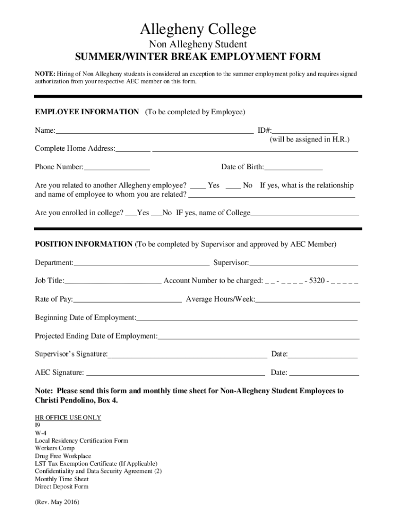 Allegheny College Non Allegheny Student SUMMER/WINTER BREAK EMPLOYMENT FORM NOTE: Hiring of Non Allegheny students is considered an exception to the summer employment policy and requires signed authorization