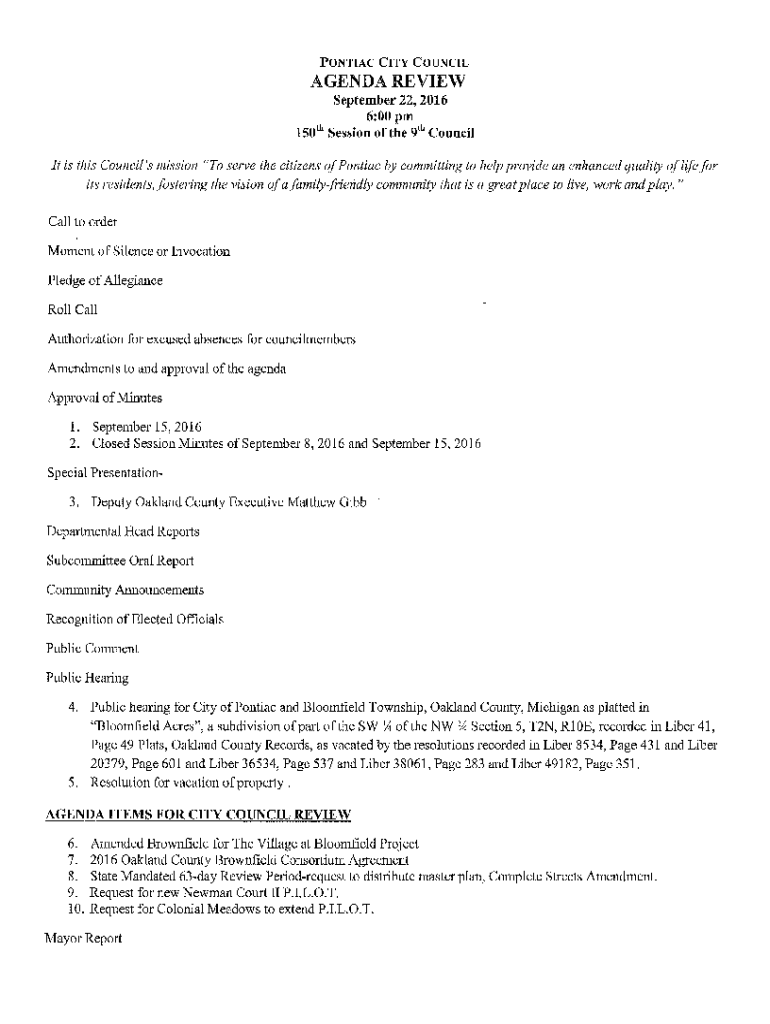 PONTIAC CITY COUNCILAGENDA REVIEW September 22, 2016 6:00pm 150 1h Session of the 91h Council It is this Council\'s mission \” To serve the citizens of Pontiac by committing to help provide an enhanced