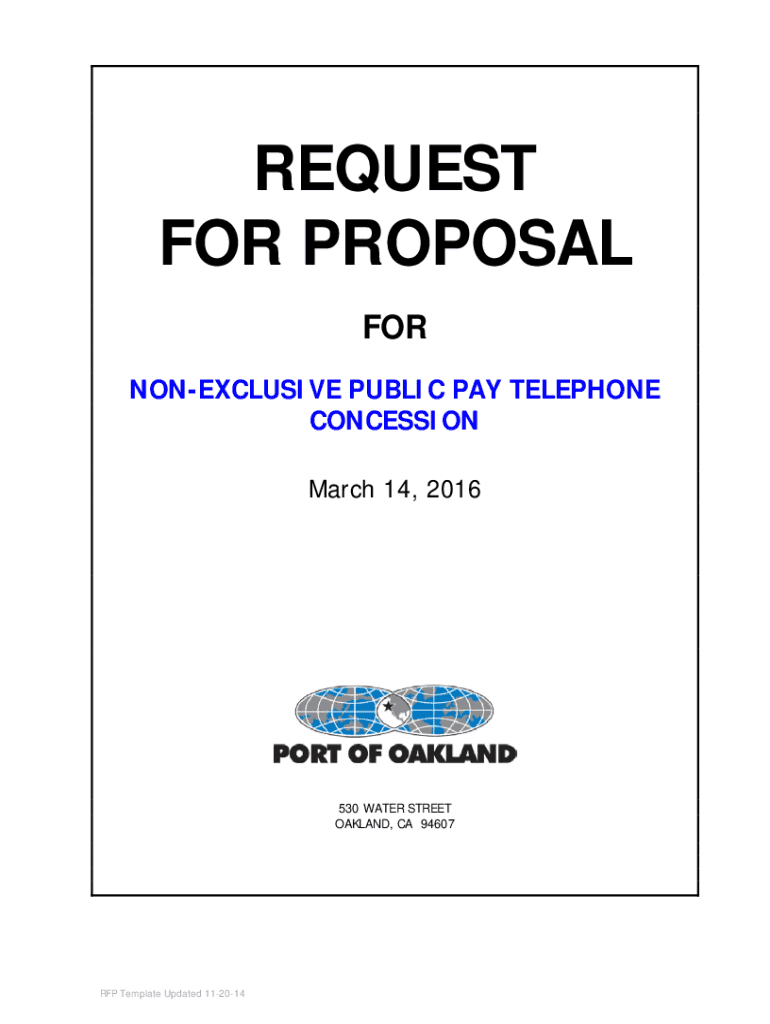 REQUEST FOR PROPOSAL FOR NONEXCLUSIVE PUBLIC PAY TELEPHONE CONCESSION March 14, 2016530 WATER STREET OAKLAND, CA 94607RFP Template Updated 112014REQUEST FOR Proposal Port of Oakland (the Port), Oakland,