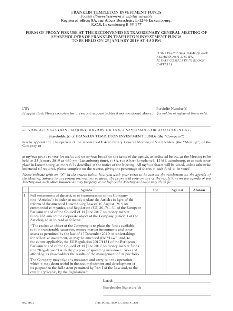 FRANKLIN TEMPLETON INVESTMENT FUNDS So cit dinvestissement capital variable Registered office: 8A, rue Albert Brochette L1246 Luxembourg, R.C.S. Luxembourg B 35 177 FORM OF PROXY FOR USE AT THE RECONVENED