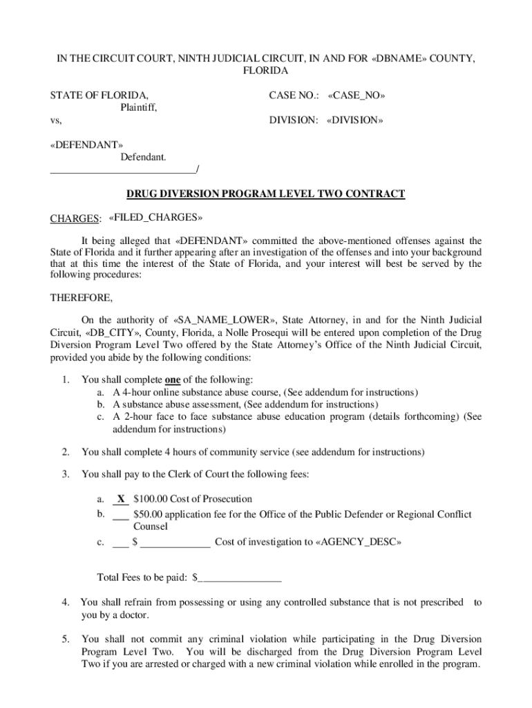 IN THE CIRCUIT COURT, NINTH JUDICIAL CIRCUIT, IN AND FOR NAME COUNTY, FLORIDA STATE OF FLORIDA, Plaintiff, vs, CASE NO.: CASE_NO DIVISION: DIVISIONDEFENDANT Defendant. ___/ DRUG DIVERSION PROGRAM