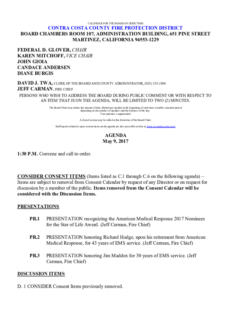 CALENDAR FOR THE BOARD OF DIRECTORSCONTRA COSTA COUNTY FIRE PROTECTION DISTRICT BOARD CHAMBERS ROOM 107, ADMINISTRATION BUILDING, 651 PINE STREET MARTINEZ, CALIFORNIA 945531229 FEDERAL D. GLOVER,
