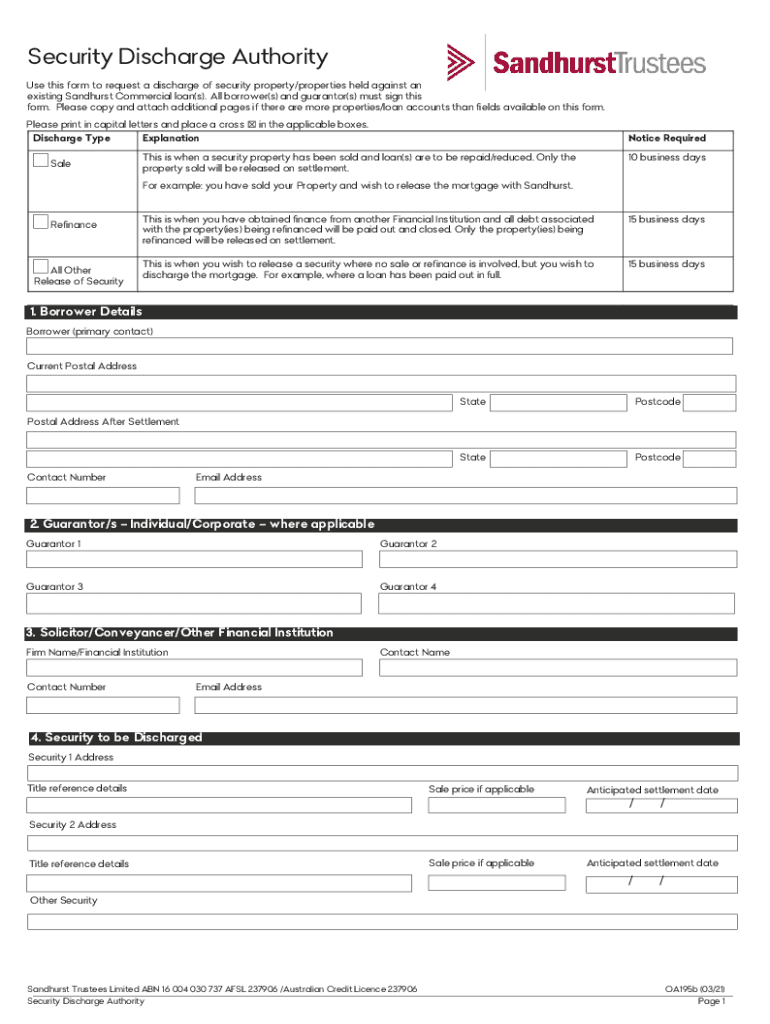 Security Discharge Authority Use this form to request a discharge of security property/properties held against an existing Sandhurst Commercial loan(s). All borrower(s) and guarantor(s) must sign