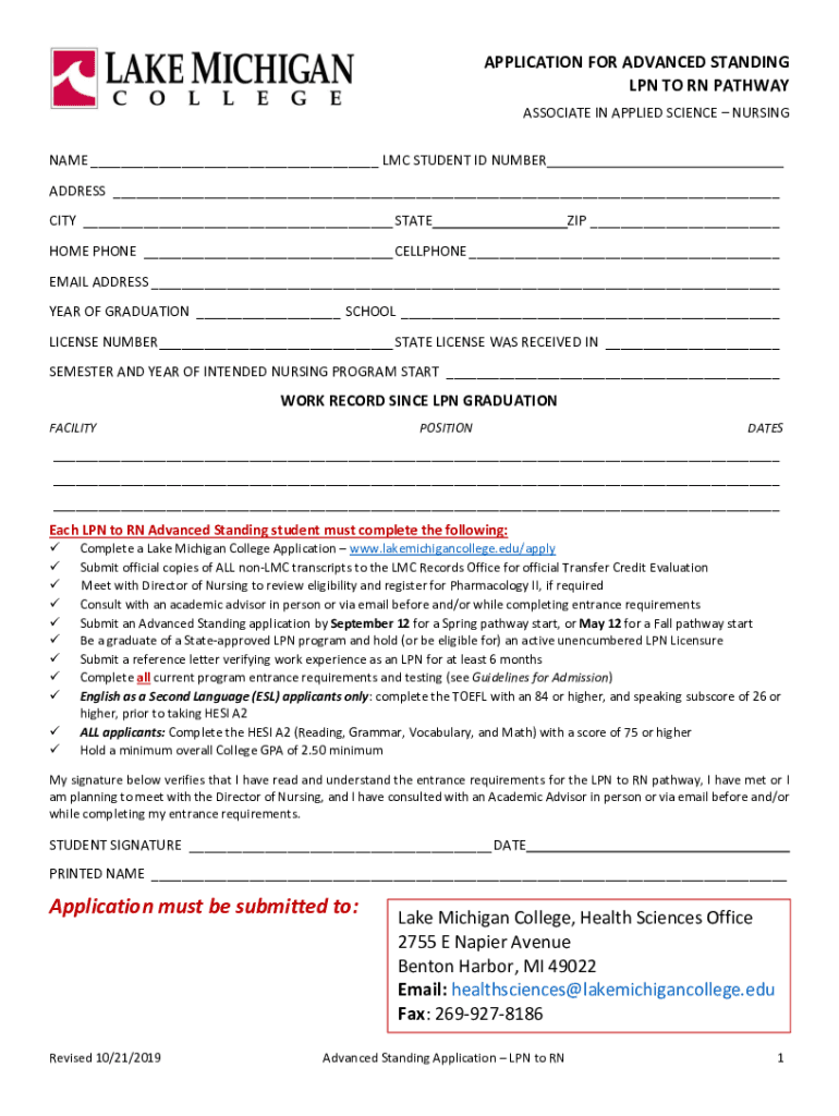APPLICATION FOR ADVANCED STANDING LPN TO RN PATHWAY ASSOCIATE IN APPLIED SCIENCE NURSING NAME ___ LMC STUDENT ID NUMBER ADDRESS ___ CITY ___ STATE ZIP ___HOME PHONE ___ CELLPHONE ___ EMAIL ADDRESS