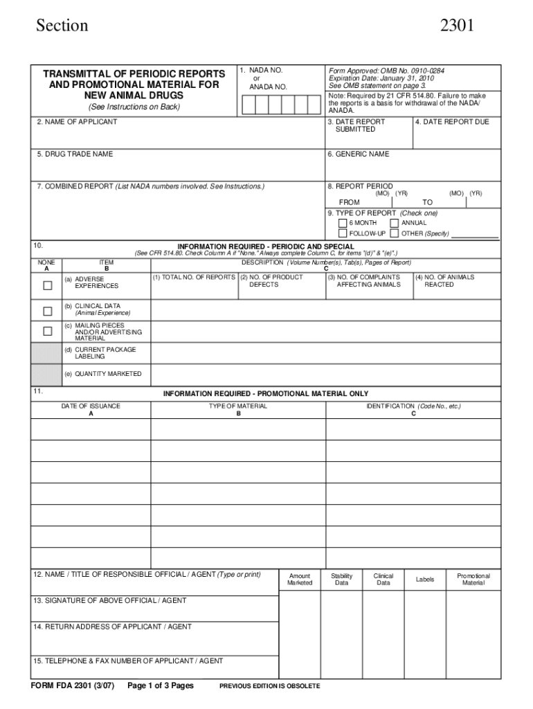 Section2301TRANSMITTAL OF PERIODIC REPORTS AND PROMOTIONAL MATERIAL FOR NEW ANIMAL DRUGS1. NASA NO. or CANADA NO.(See Instructions on Back)Form Approved: OMB No. 09100284 Expiration Date: January