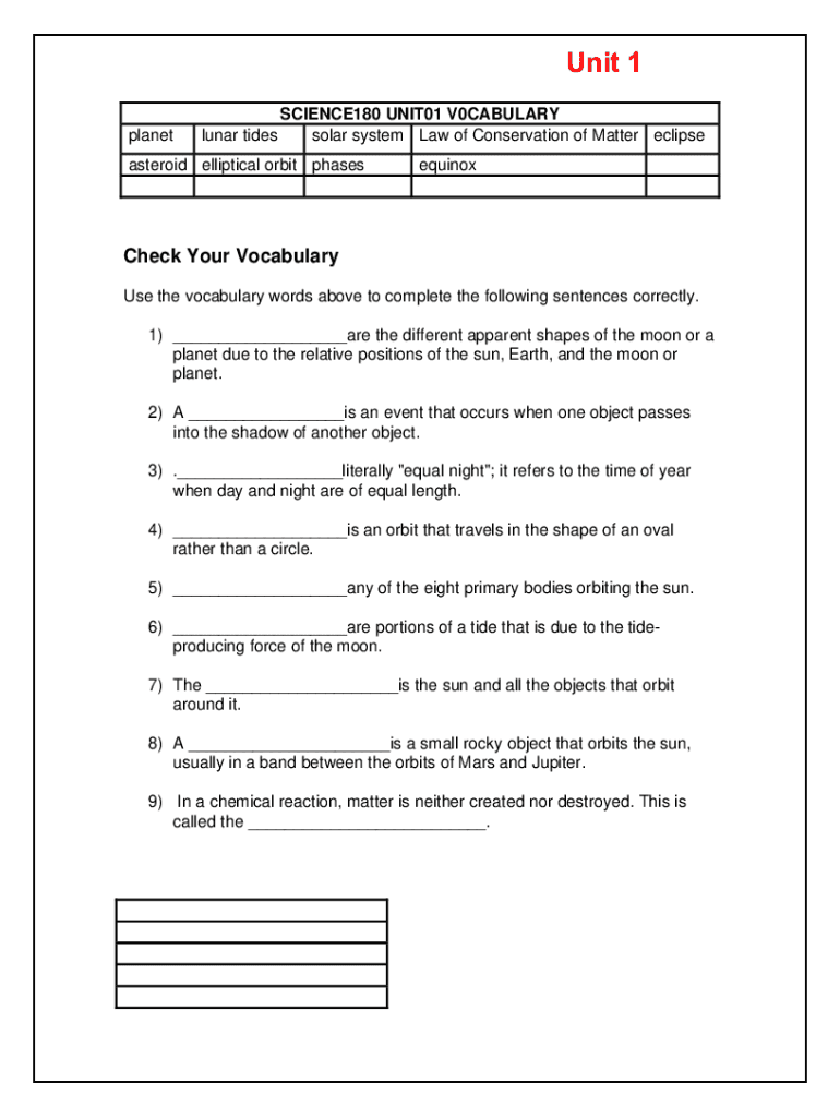 Unit 1 planet lunar tidesSCIENCE180 UNIT01 V0CABULARY solar system Law of Conservation of Matter eclipse asteroid elliptical orbit phasesequinoxCheck Your Vocabulary Use the vocabulary words above