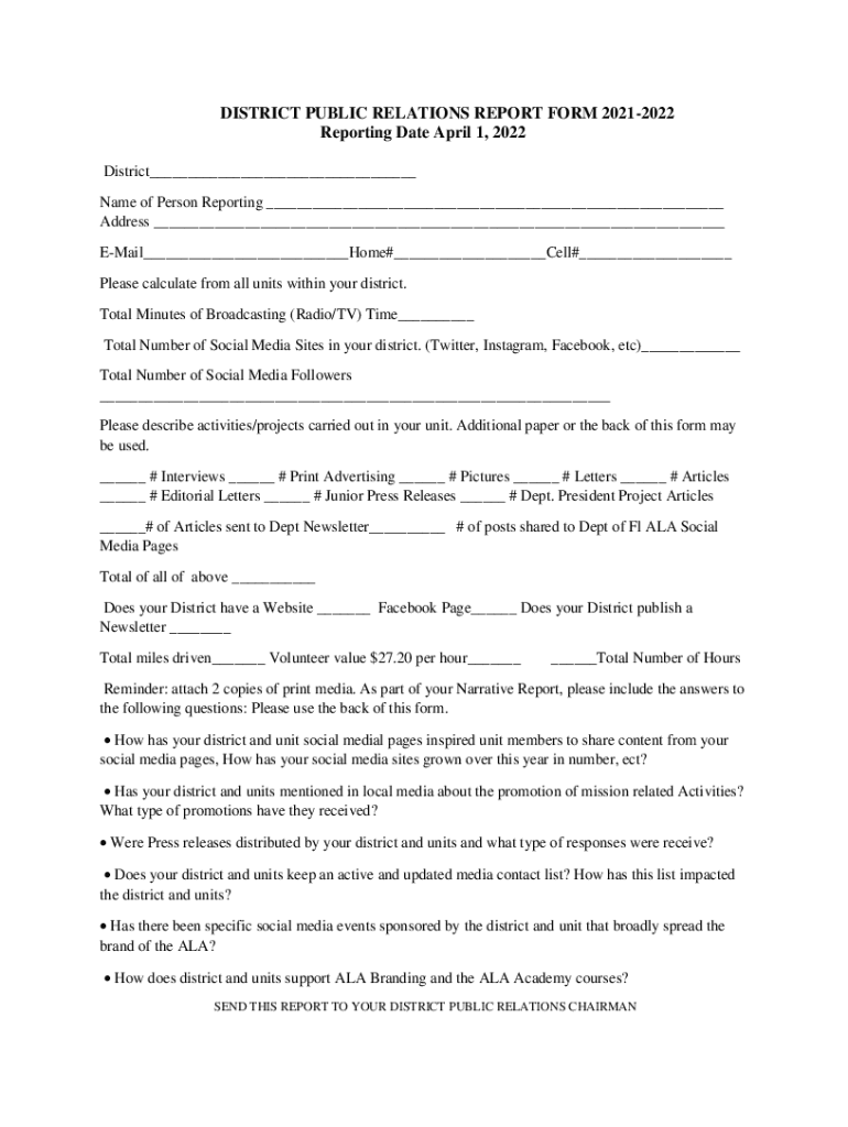 DISTRICT PUBLIC RELATIONS REPORT FORM 20212022 Reporting Date April 1, 2022, District___ Name of Person Reporting ___ Address ___ EMail___Home#___Cell#___ Please calculate from all units within your