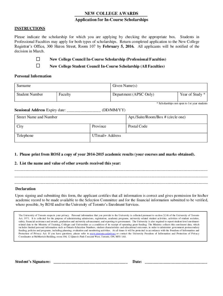 NEW COLLEGE AWARDS Application for Course Scholarships INSTRUCTIONS Please indicate the scholarship for which you are applying by checking the appropriate box. Students in Professional Faculties may