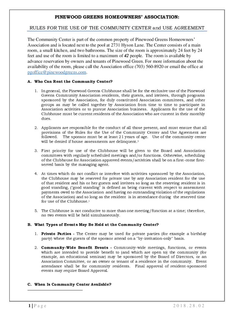 PINEWOOD GREENS HOMEOWNERS ASSOCIATION: RULES FOR THE USE OF THE COMMUNITY CENTER and USE AGREEMENT The Community Center is part of the common property of Pinewood Greens Homeowners Association and