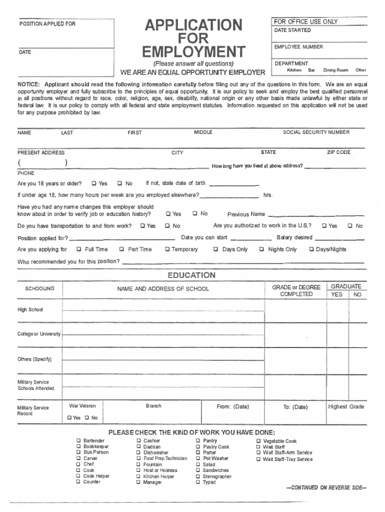 APPLICATION COMPOSITION APPLIED FORMER OFFICE USE VALIDATE STARTEDEMPLOYMENTDATEEMPLOYEE NUMBER(Please answer all questions) WE ARE AN EQUAL OPPORTUNITY EMPLOYERDEPARTMENT KitchenBarDining RoomOtherNOTICE: