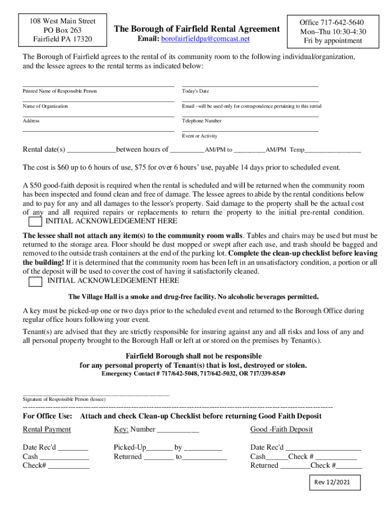 108 West Main Street PO Box 263 Fairfield PA 17320The Borough of Fairfield Rental Agreement Email: borofairfieldpa@comcast.netOffice 7176425640 Months 10:304:30 Fri by appointment Borough of Fairfield