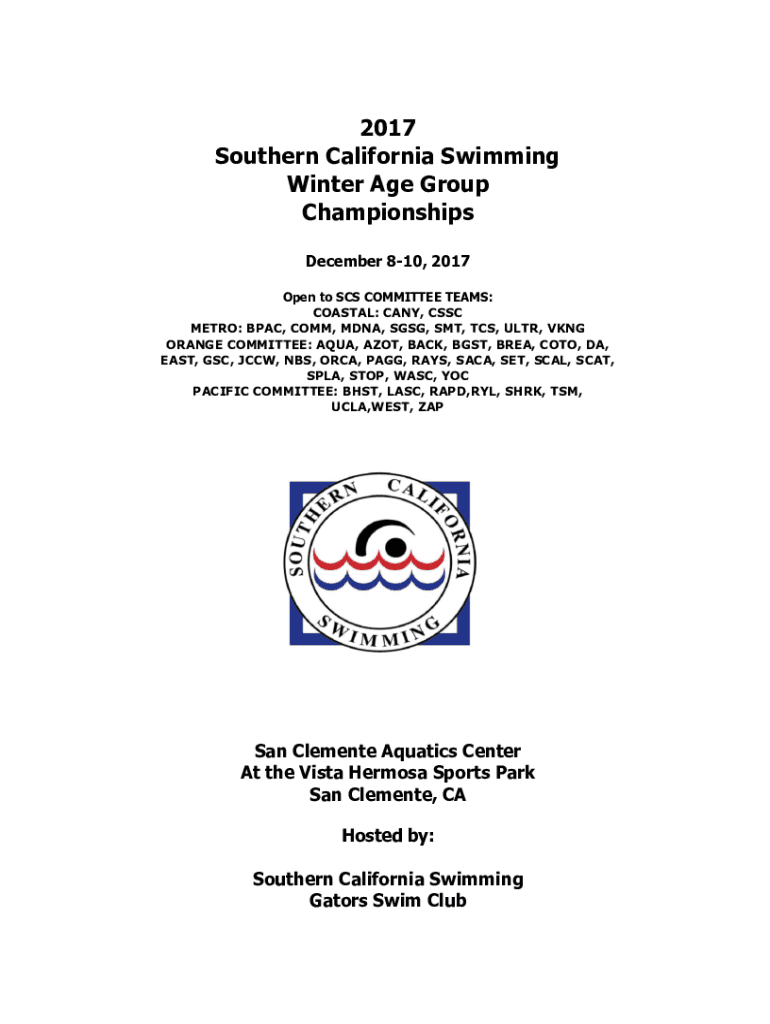 2017 Southern California Swimming Winter Age Group Championships December 810, 2017 Open to SCS COMMITTEE TEAMS: COASTAL: ANY, CSS METRO: PAC, COMM, EDNA, SGDG, SMT, TCS, ULTRA, VANG ORANGE COMMITTEE: