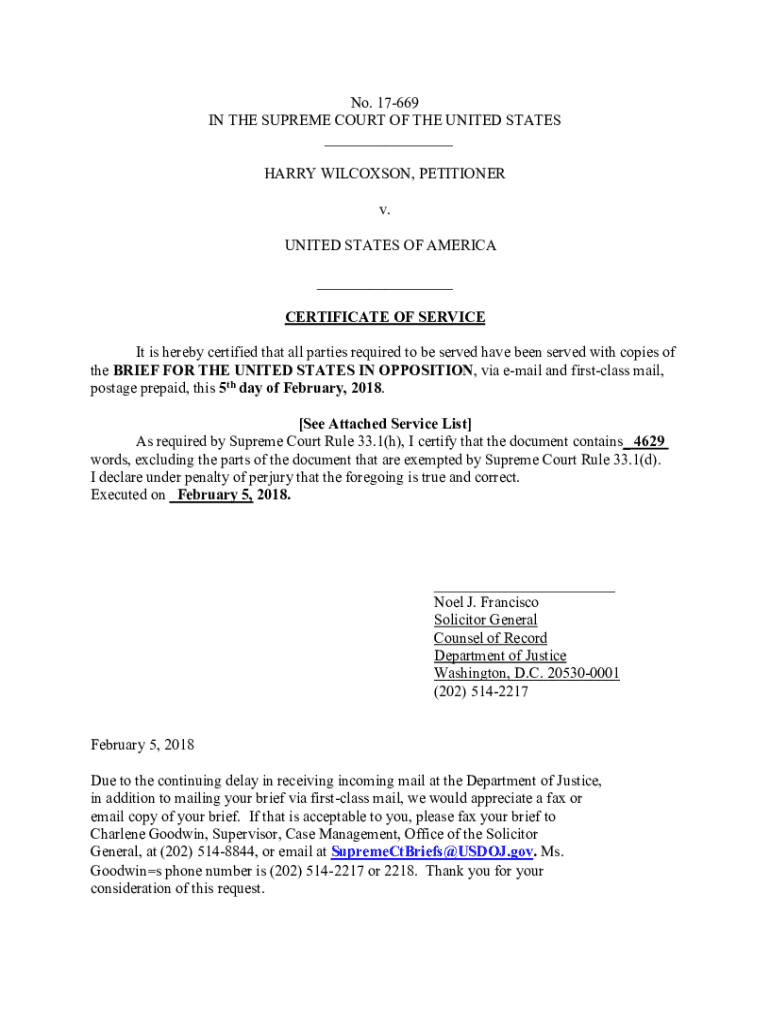 No. 17669 IN THE SUPREME COURT OF THE UNITED STATES ___ HARRY WILSON, PETITIONER v. UNITED STATES OF AMERICA ___ CERTIFICATE OF SERVICE It is hereby certified that all parties required to be served