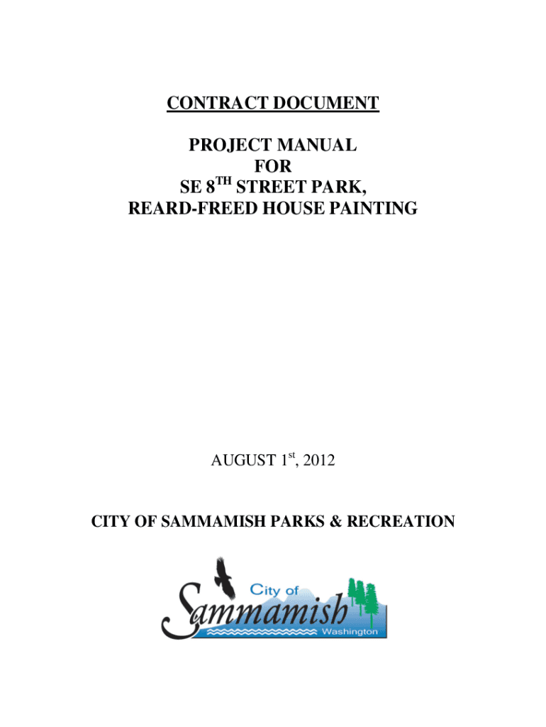 CONTRACT DOCUMENT PROJECT MANUAL FOR SE 8TH STREET PARK, REORDERED HOUSE PAINTINGAUGUST 1st, 2012CITY OF SAMMAMISH PARKS & RECREATIONPROJECT MANUAL FOR TH SE 8 STREET PARK REORDERED HOUSE PAINTINGOwner:City