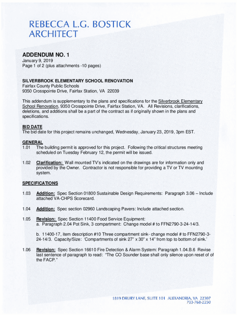 ADDENDUM NO. 1 January 9, 2019-Page 1 of 2 (plus attachments 10 pages)SILVERBROOK ELEMENTARY SCHOOL RENOVATION Fairfax County Public Schools 9350 Crosspiece Drive, Fairfax Station, VA 22039 This addendum