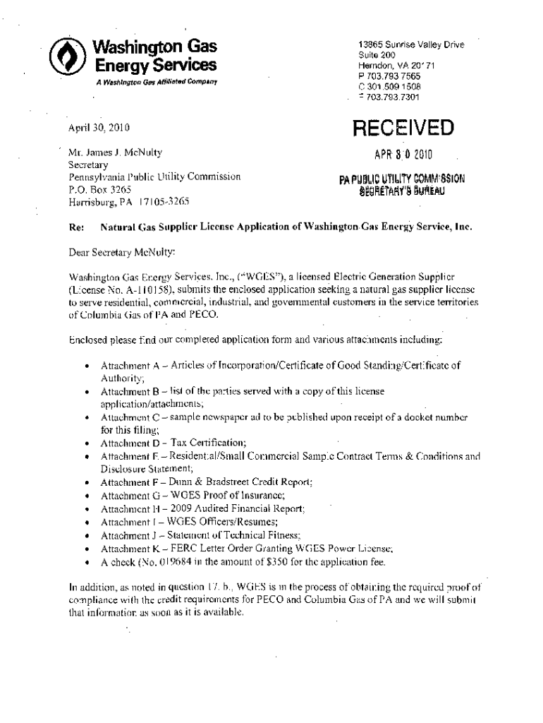 S^52Mnr,8eValleyDrive Hem don. VA 20171/ X Washington Gas VC/ Energy Services ^ \” up×r.u* AWasNastonGasAHlUatetiCompany703.793.7565 C 301,509.1508. April 30, 2010, Mr. James J. McNulty Secretary