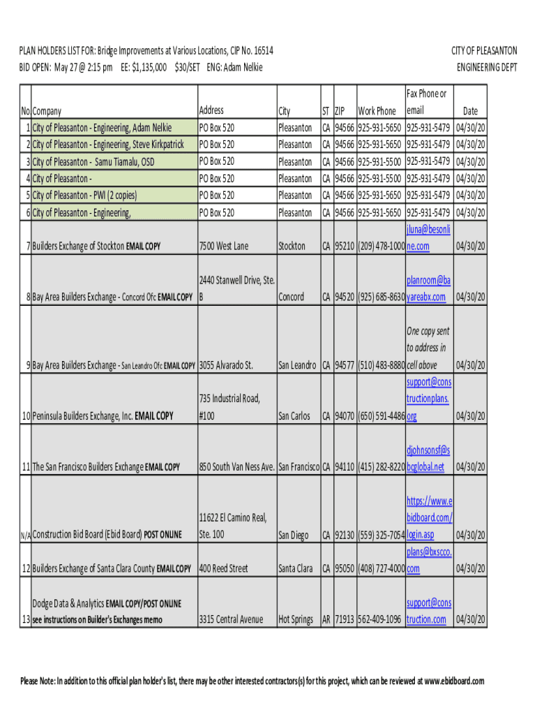 PLAN HOLDERS LIST FOR: Bridge Improvements at Various Locations, CIP No. 16514 BID OPEN: May 27 @ 2:15 pm EE: $$1,135,00030/SET ENG: Adam Nellie No. Company 1 City of Pleasant on Engineering, Adam
